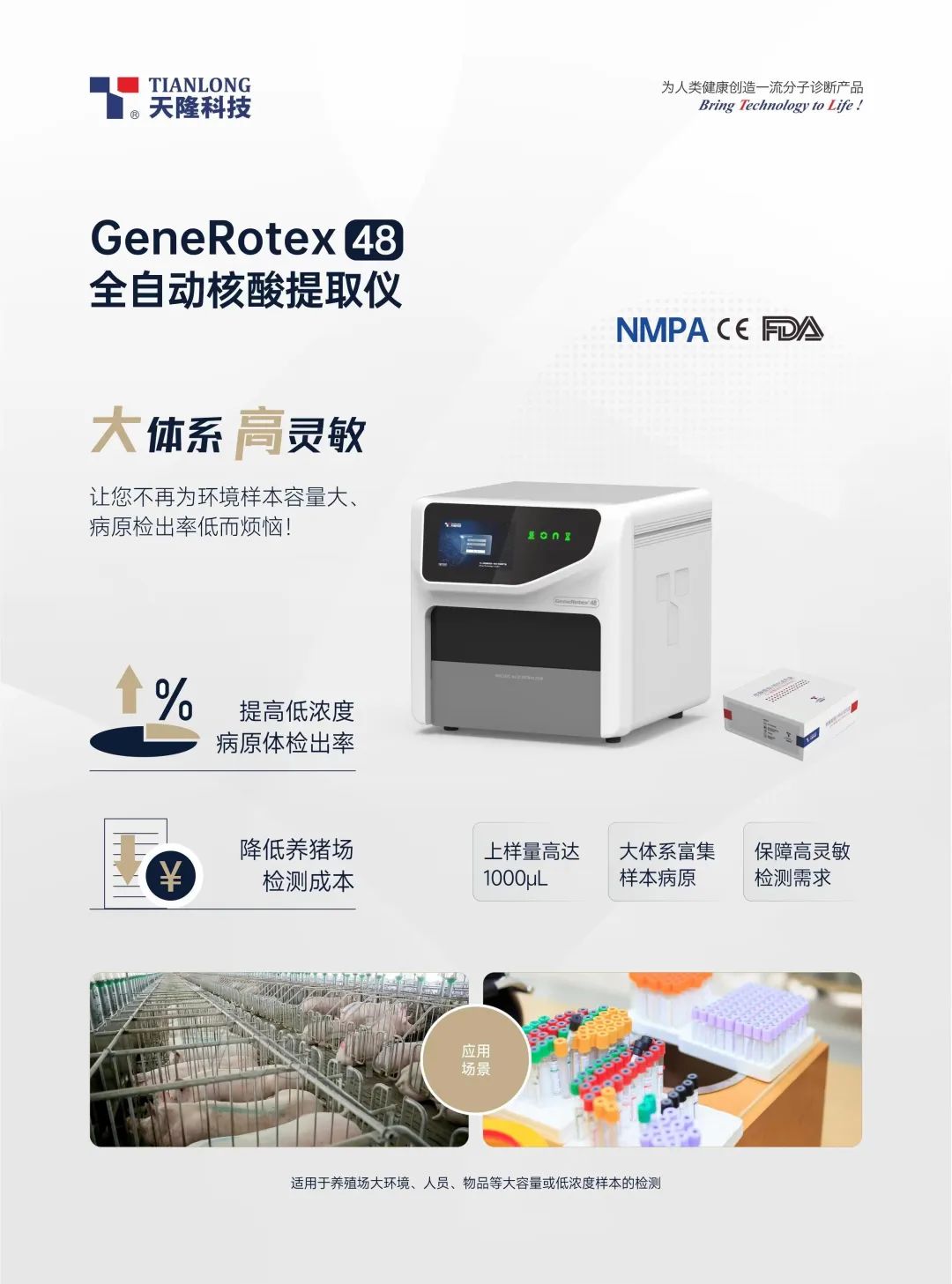 天隆科技的非洲豬瘟病毒核酸檢測試劑(熒光PCR法)獲得泰國醫(yī)療器械TFDA注冊認證,配套儀器GeneRotex 48 和NP968-C也獲得了NMPA、CE、FDA醫(yī)療器械認證。其中,GeneRotex 48全自動核酸提取儀及配套試劑,上樣量高達1000uL,大體系富集樣本病原,能保障高靈敏檢測需求。該提取系統(tǒng)可提高低濃度病原體檢出率、降低養(yǎng)豬場檢測成本,特別適用于養(yǎng)殖場大環(huán)境、人員、物品樣本和豬鼻(咽)拭子、血液等大容量或低濃度樣本的檢測。