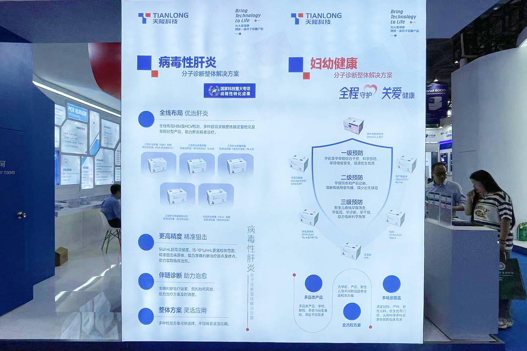 展會(huì)期間,天隆參與的國(guó)家科技重大專(zhuān)項(xiàng)戰(zhàn)略性轉(zhuǎn)化成果:超高敏乙肝病毒(HBV)核酸測(cè)定試劑盒,及人運(yùn)動(dòng)神經(jīng)元存活基因1(SMN1)等試劑產(chǎn)品同樣吸引了參展人員諸多目光。