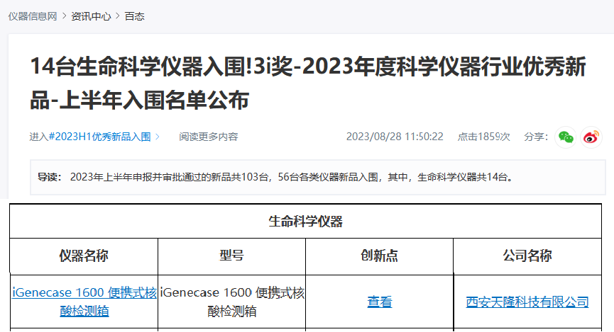 近日,儀器及檢測(cè)3i獎(jiǎng)-2023年度科學(xué)儀器行業(yè)優(yōu)秀新品-上半年入圍名單公布,天隆iGenecase 1600便攜式核酸檢測(cè)箱入圍(點(diǎn)擊“閱讀原文”了解)。該獎(jiǎng)項(xiàng)由儀器信息網(wǎng)于2006年發(fā)起,每年由專業(yè)+網(wǎng)絡(luò)評(píng)審團(tuán)評(píng)出,旨在將中國(guó)生命科學(xué)領(lǐng)域創(chuàng)新突出的國(guó)內(nèi)外儀器產(chǎn)品在全國(guó)范圍內(nèi)進(jìn)行全面、公正、客觀展示。