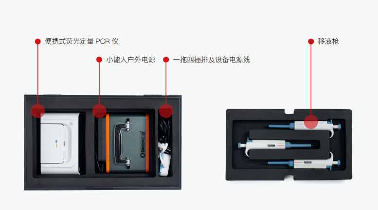 該檢測(cè)箱核心設(shè)備為天隆GeneFlex 16全自動(dòng)核酸提取儀和Gentier mini/mini+便攜式熒光定量PCR儀,配備小能人戶外電源及相應(yīng)實(shí)驗(yàn)試劑耗材等,可搭載日常公共交通,實(shí)現(xiàn)拉箱即走,快速到達(dá)各類檢測(cè)現(xiàn)場(chǎng),讓檢測(cè)不再受限。適用于食品安全、出入境檢疫、傳染病處置等多場(chǎng)景的現(xiàn)場(chǎng)檢測(cè)。