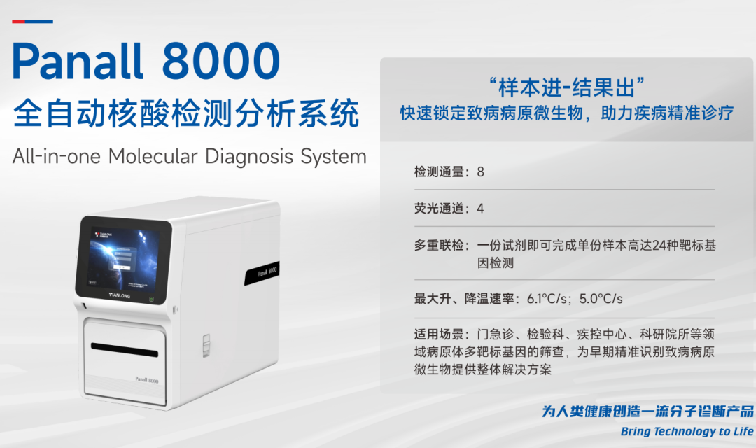 今年推出的人類ApoE、SLCO1B1基因多態(tài)性檢測試劑等就是為滿足精準(zhǔn)醫(yī)療背景下他汀個體化用藥需求而研發(fā),而Panall 8000全自動多重病原檢測分析系統(tǒng)則是適應(yīng)分子診斷行業(yè)發(fā)展趨勢的又一自主創(chuàng)新產(chǎn)品,旨在實現(xiàn)呼吸道、消化道、血液系統(tǒng)感染等癥候群相關(guān)病原微生物一“管”聯(lián)檢,為門急診快速檢測提供更加集約高效的解決方案。