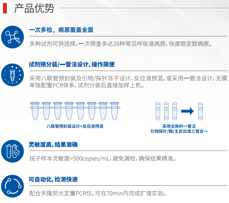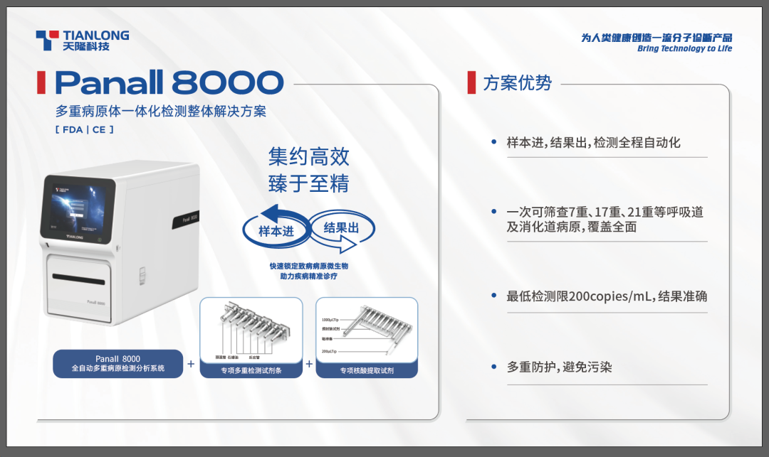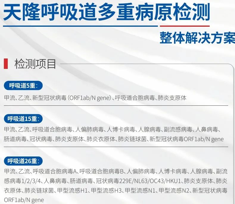 天隆多重呼吸道感染分子診斷方案,覆蓋流感、肺炎支原體、新冠、呼吸道合胞、鼻病毒、腺病毒等近百種檢測項(xiàng)目,方案包含系列設(shè)備及配套試劑,并有核酸檢測一體機(jī)及傳統(tǒng)提取+熒光PCR平臺可選,助力早期診斷和及時(shí)鑒別,為您的健康保駕護(hù)航。
