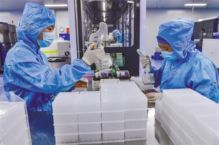 2023年12月26日,工人在西安天隆科技有限公司試劑生產(chǎn)車間進行核酸提取試劑生產(chǎn)。 本報記者 袁景智攝